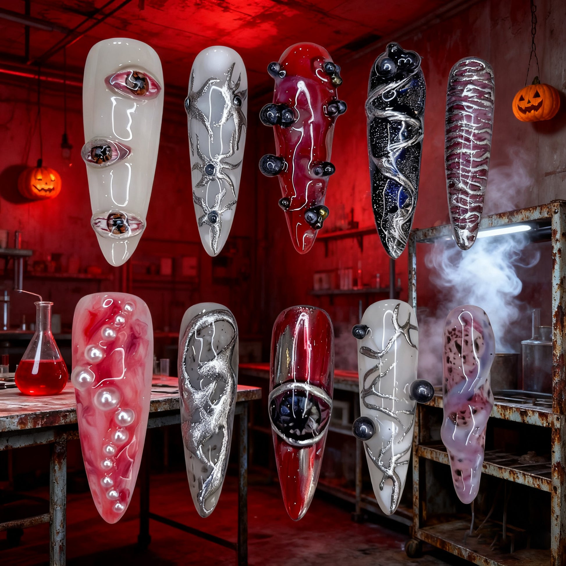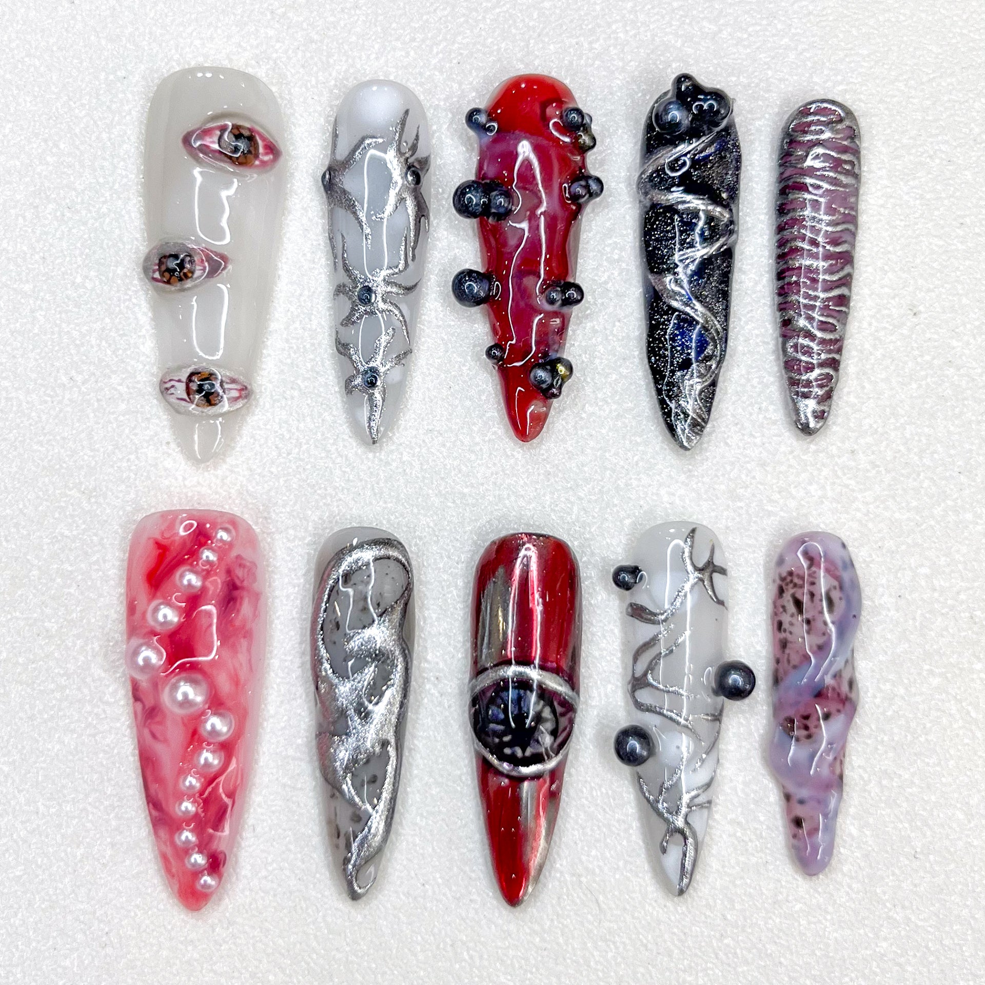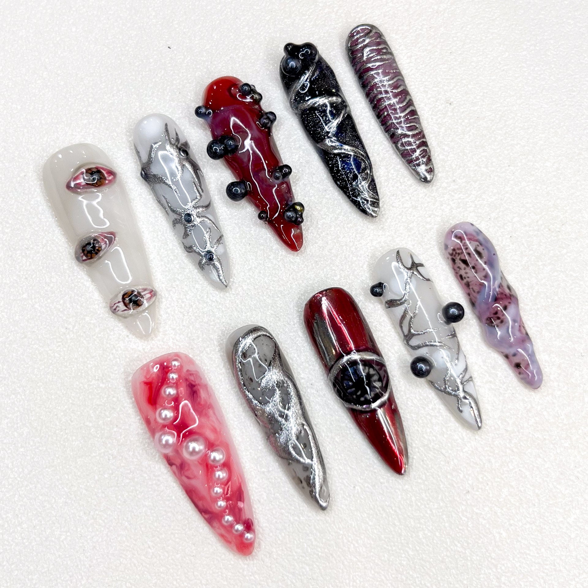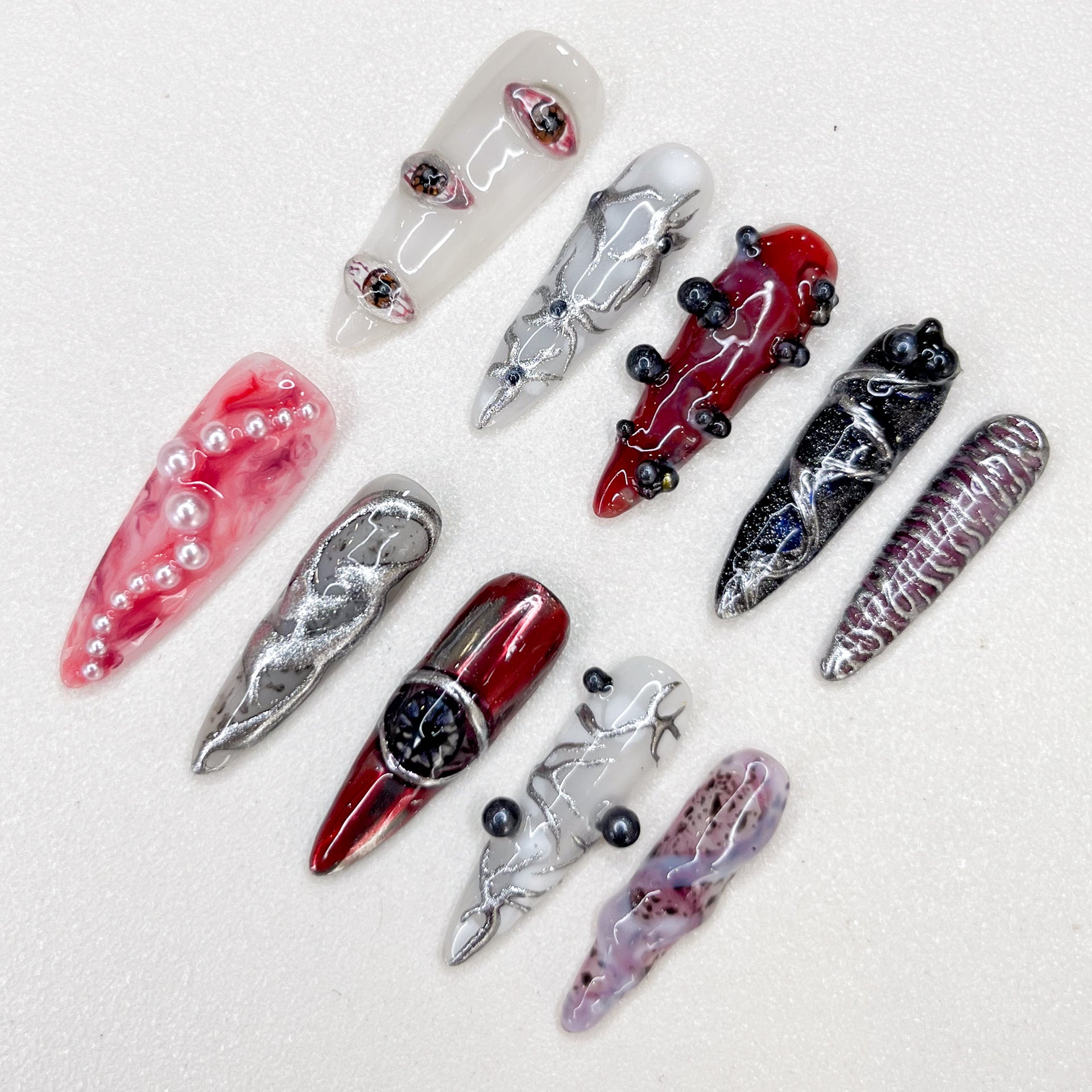 Every nail is meticulously handcrafted with 3D sculpted details that feel terrifyingly real while still wearable. The mid-length shape balances bold visual drama with comfortable fit, making it ideal for festive occasions or statement everyday styles.