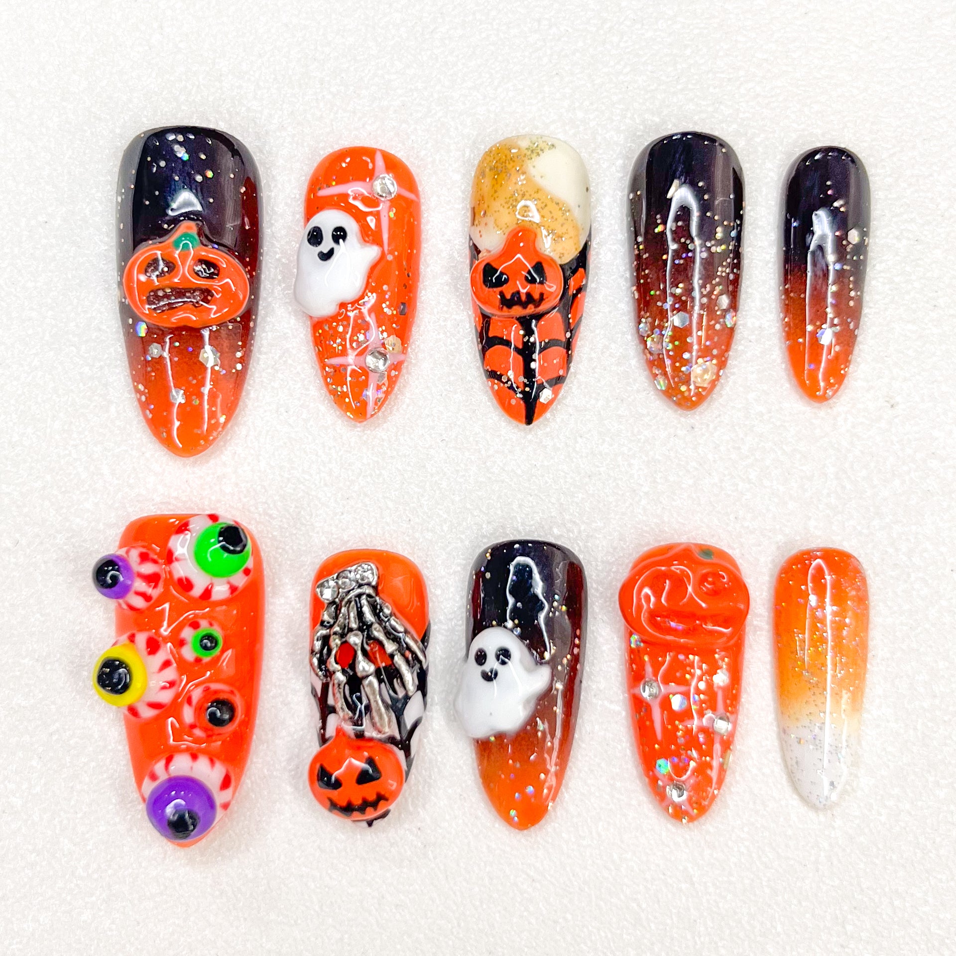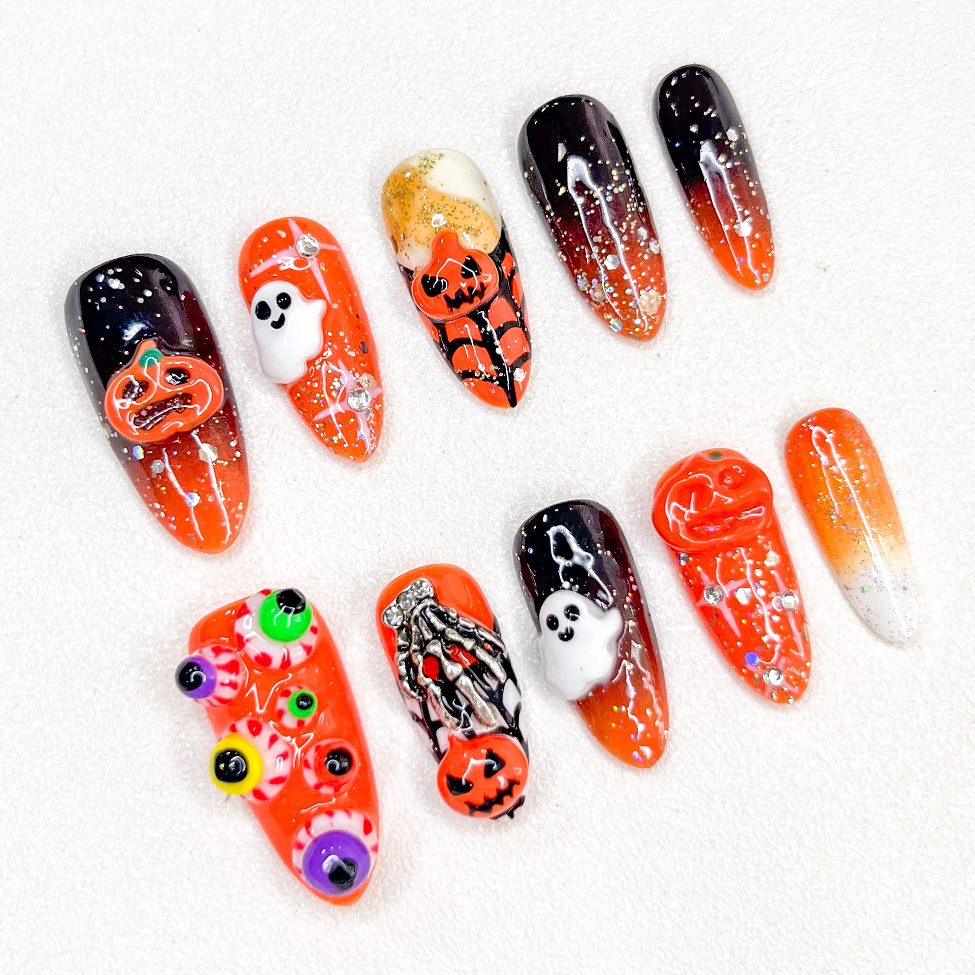Each set features colorful 3D eyeballs, a striking skeleton hand clutching a pumpkin, along with adorable 3D ghosts and classic jack-o’-lanterns. The nails are finished with a gradient ombre effect, enriched by sparkling glitter for extra dimension and shine. The vivid mix of colors makes this set perfect for those who love individuality and bold fashion statements.