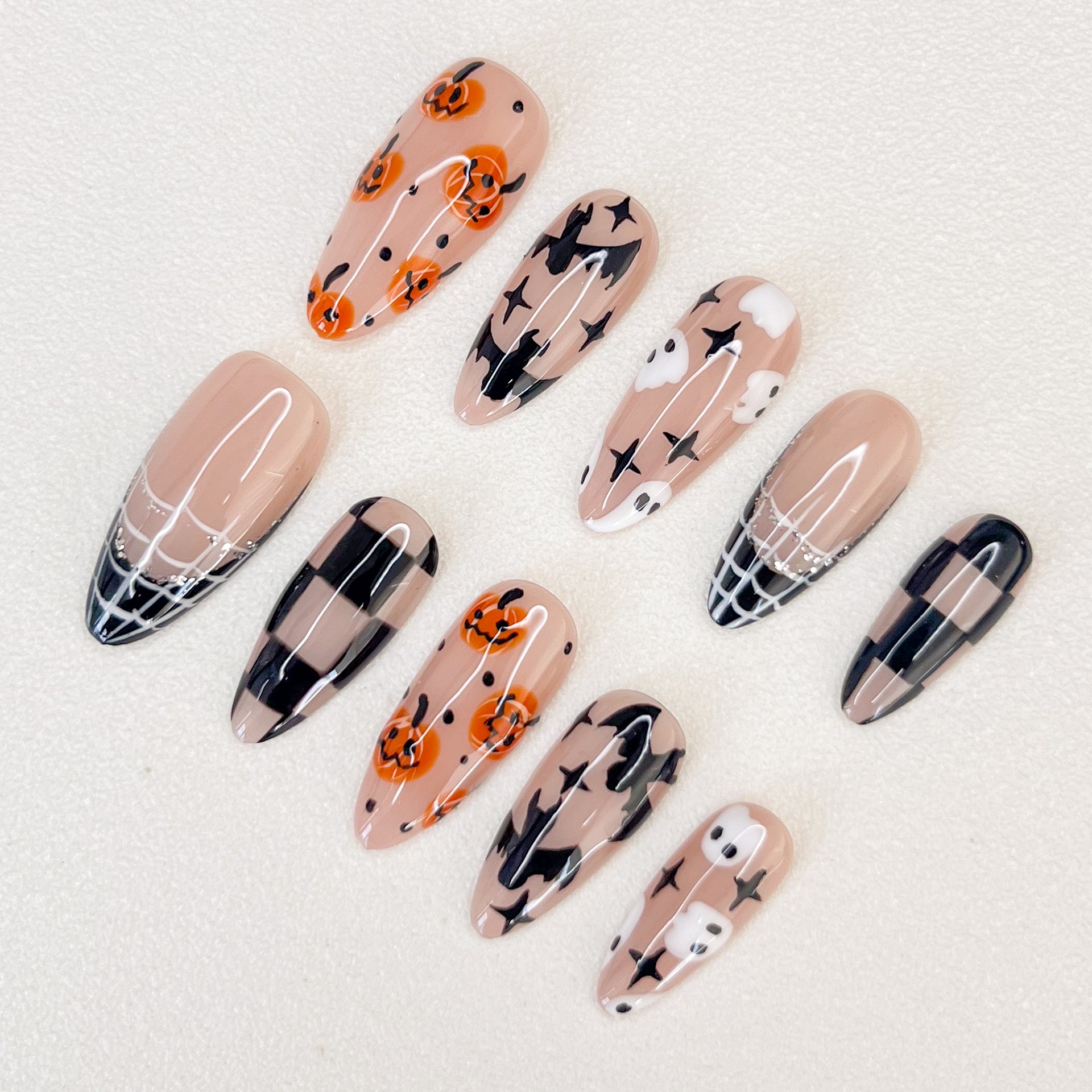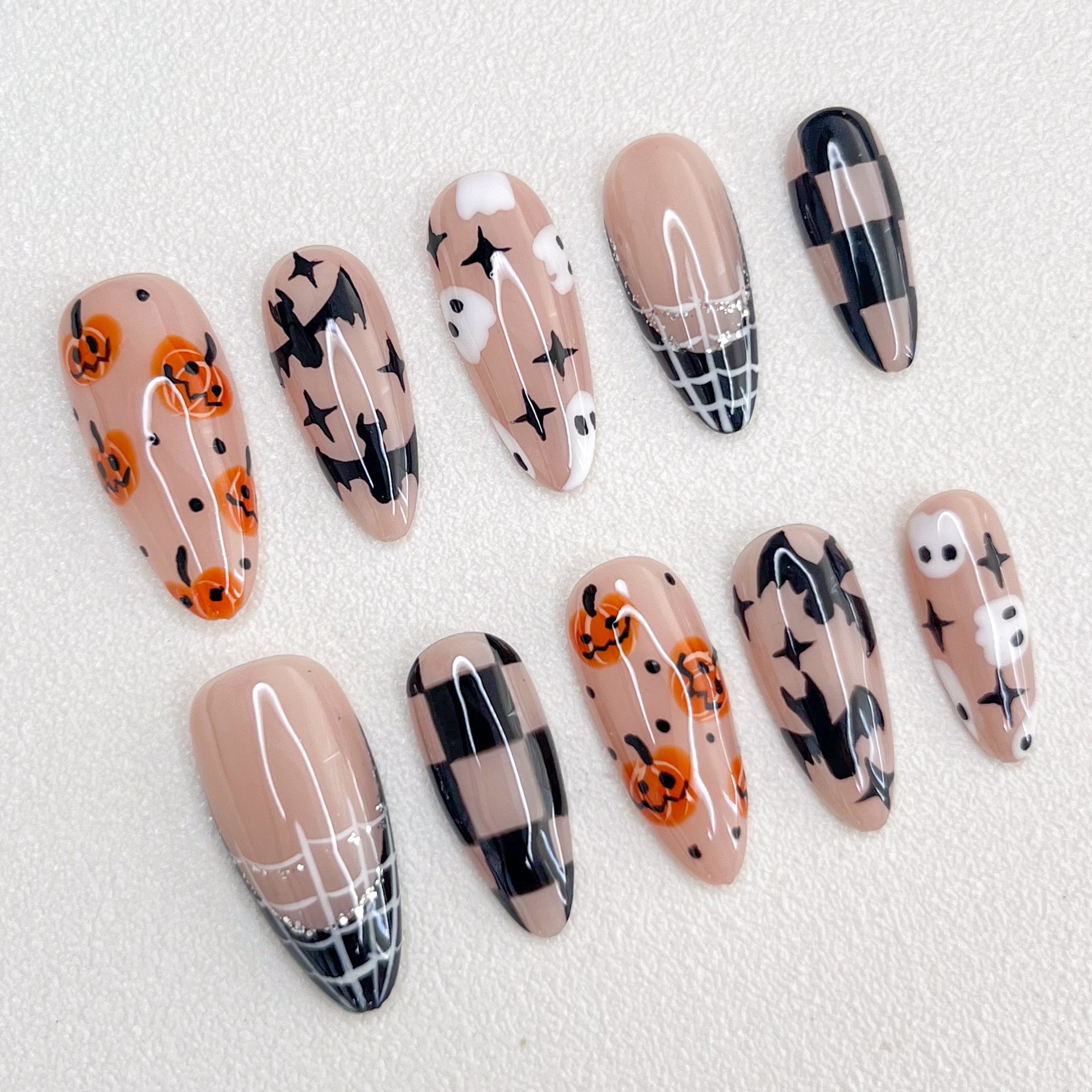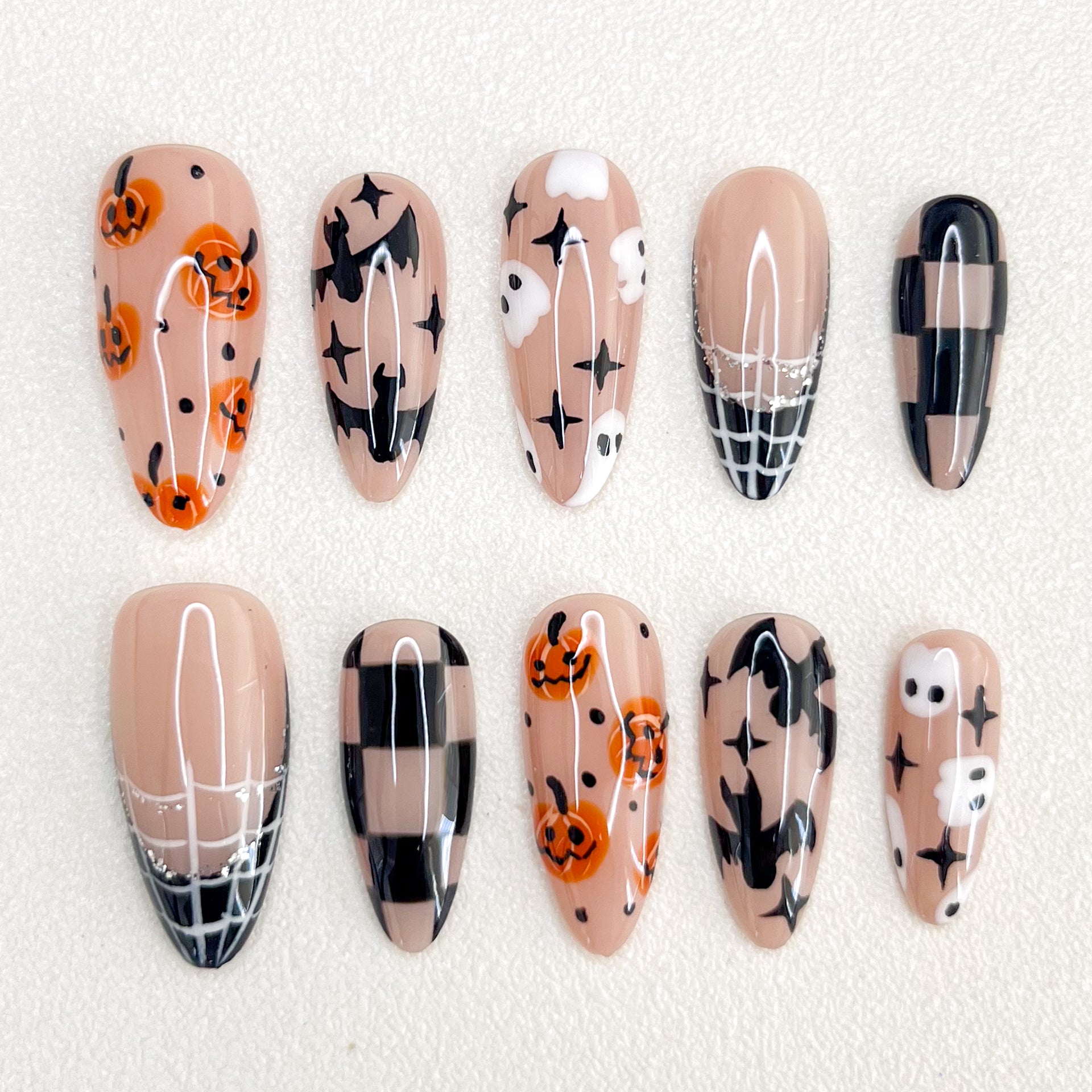 Halloween Charm is our 2025 signature press-on nail set and the most recommended style for the season. Designed to capture both the spooky fun and chic elegance of Halloween, this set features hand-painted white ghosts, glowing orange pumpkins, doodle-style bats, and French tip spider web accents. The black plaid detailing adds a modern touch, making it as fashionable as it is festive.