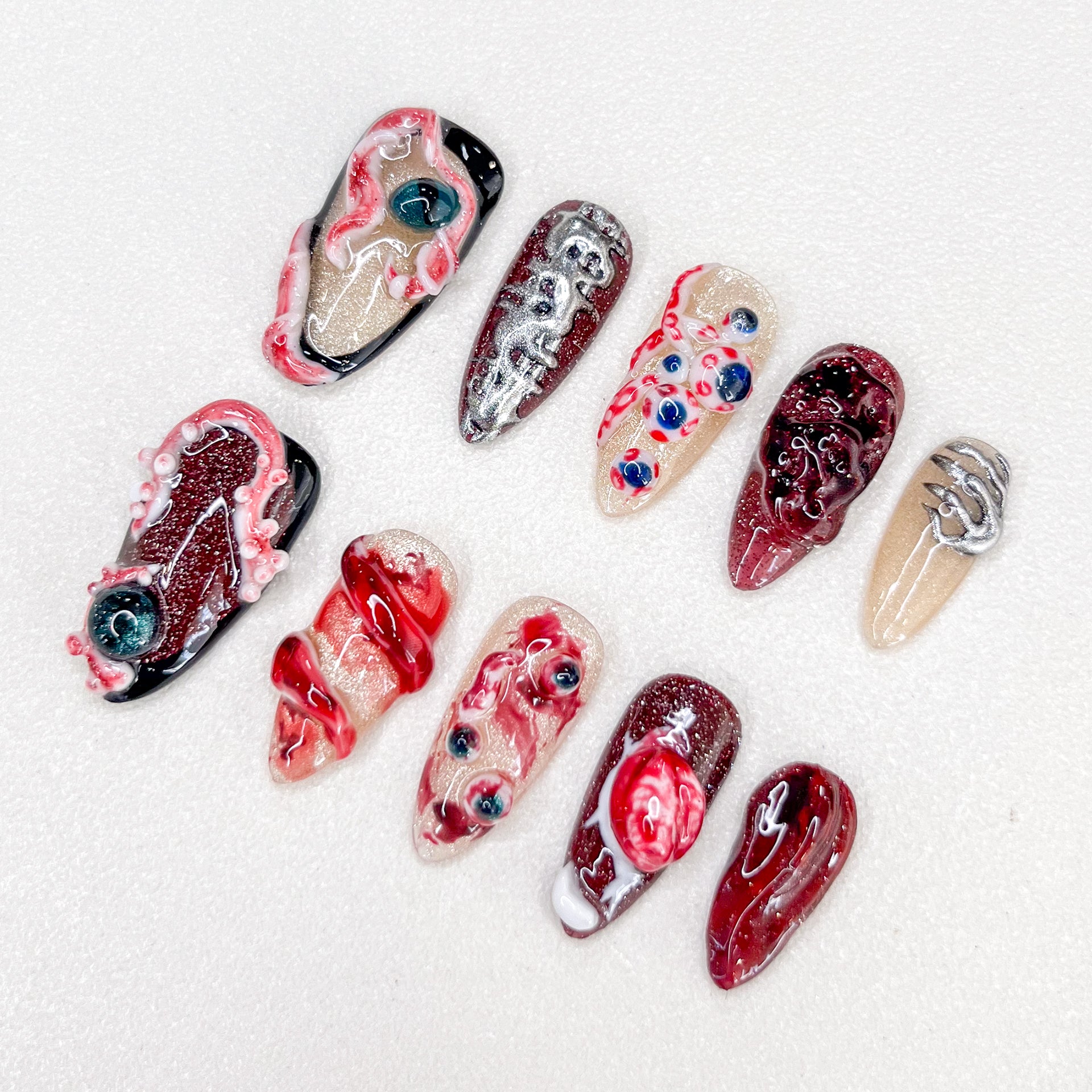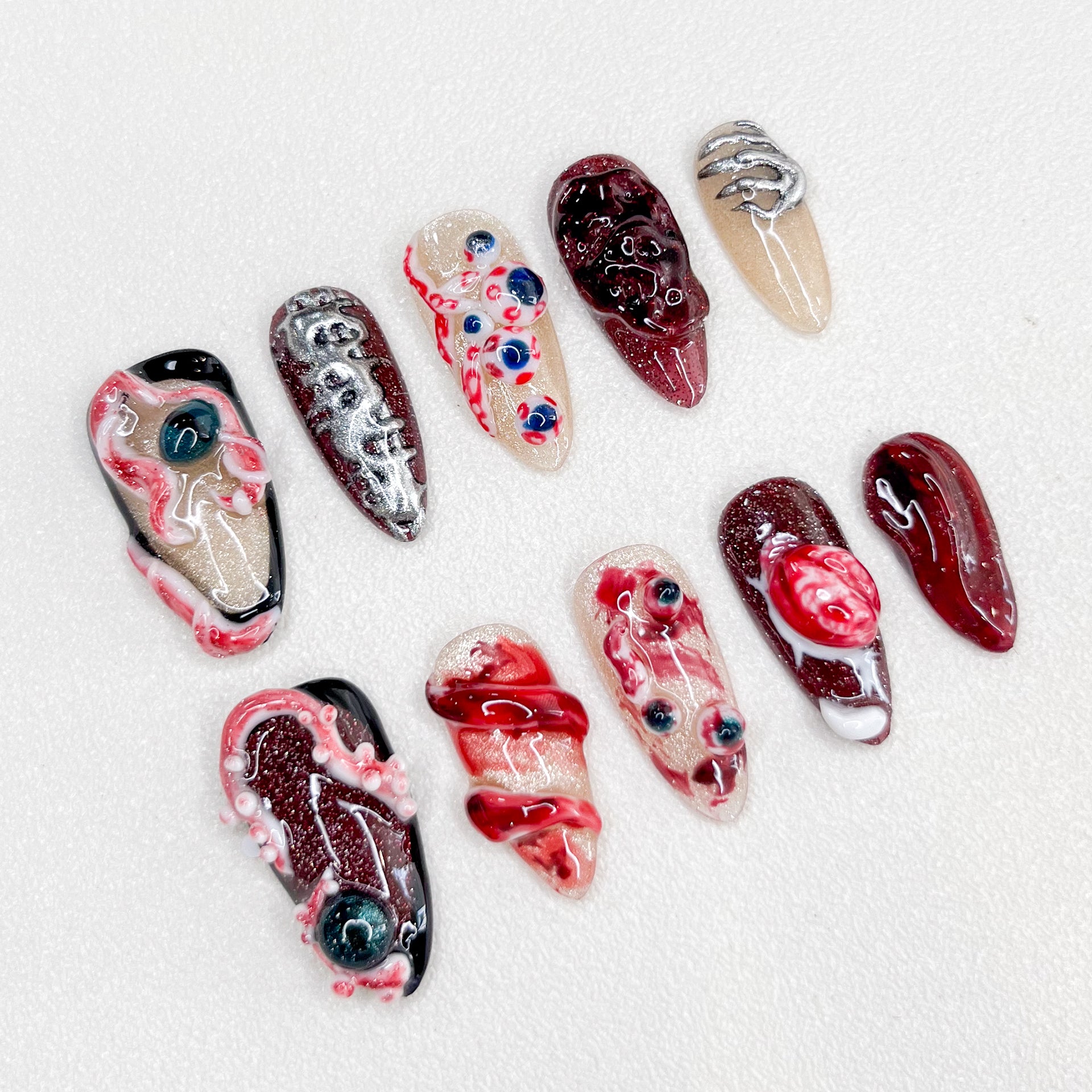 Each set is meticulously handcrafted with a 3D sculpted design, ensuring every detail feels lifelike and eye-catching. Despite their terrifying look, the short length makes them practical and comfortable for daily wear. Crafted from durable acrylic, these nails are reusable, safe for natural nails, and deliver a salon-quality finish at home.