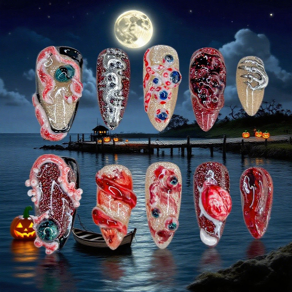 Horror Abyss is a unique 2025 Halloween press-on nail set featuring a chilling mix of 3D eyeballs, octopus tentacles, and dripping blood effects. The realistic horror-inspired details make these nails the ultimate accessory for Halloween costume parties, cosplay events, or anyone who loves bold and spooky nail art.