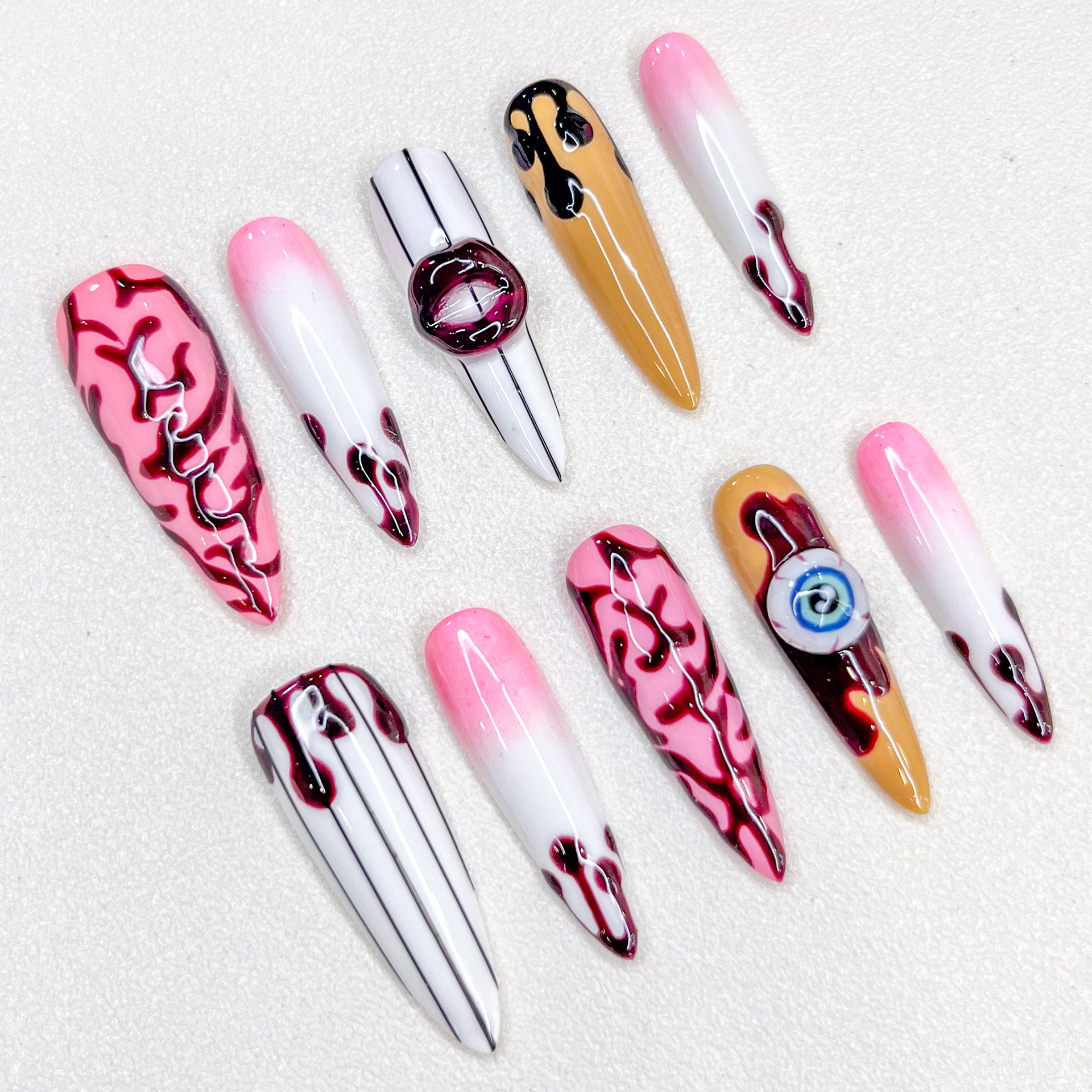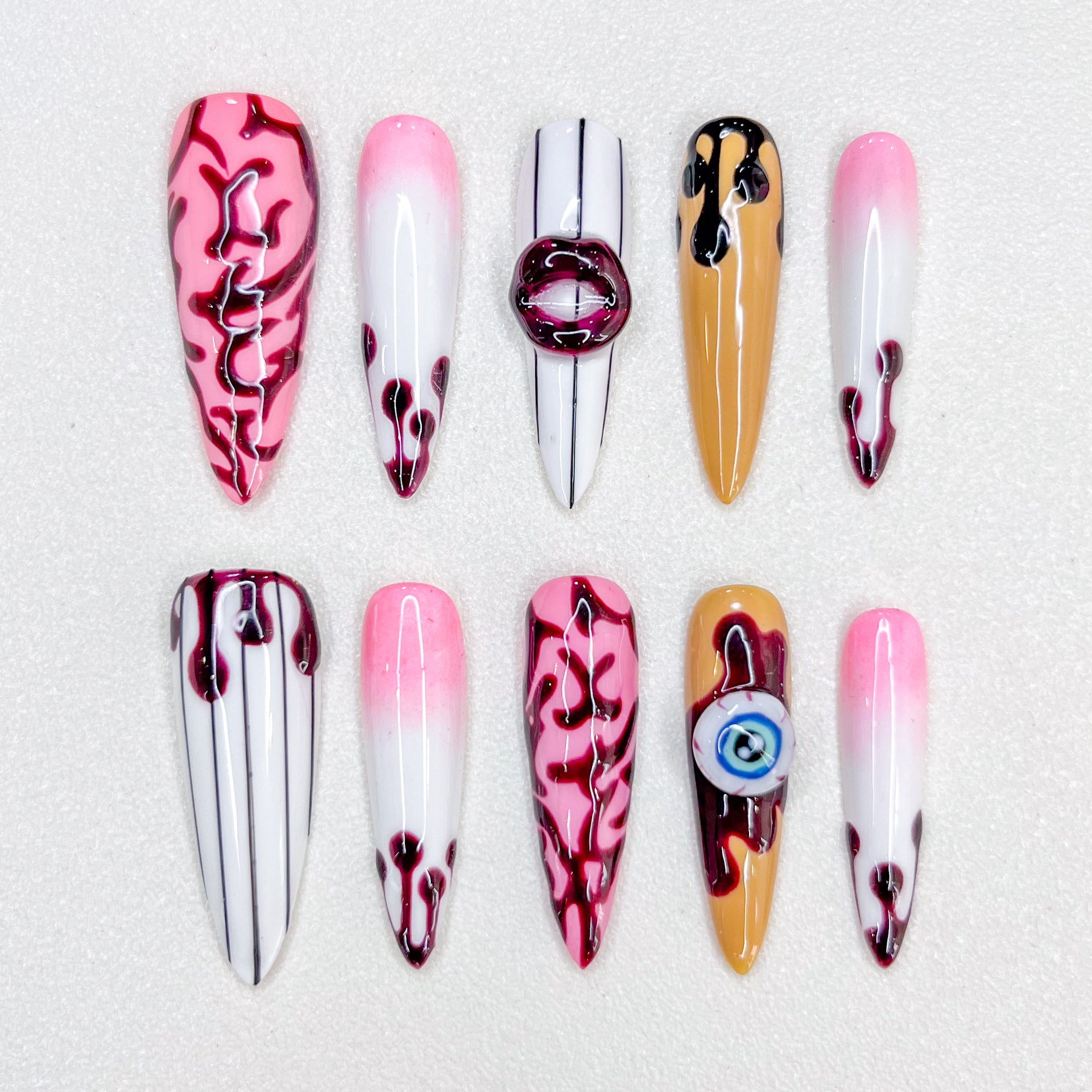 Pink Brain is our hauntingly chic 2025 Halloween press-on nail set, blending spooky horror with playful abstract art. Featuring a pink and white base with bold black geometric lines, hand-painted realistic red blood drips, and 3D textured details, this design captures the perfect mix of creepy and cute.