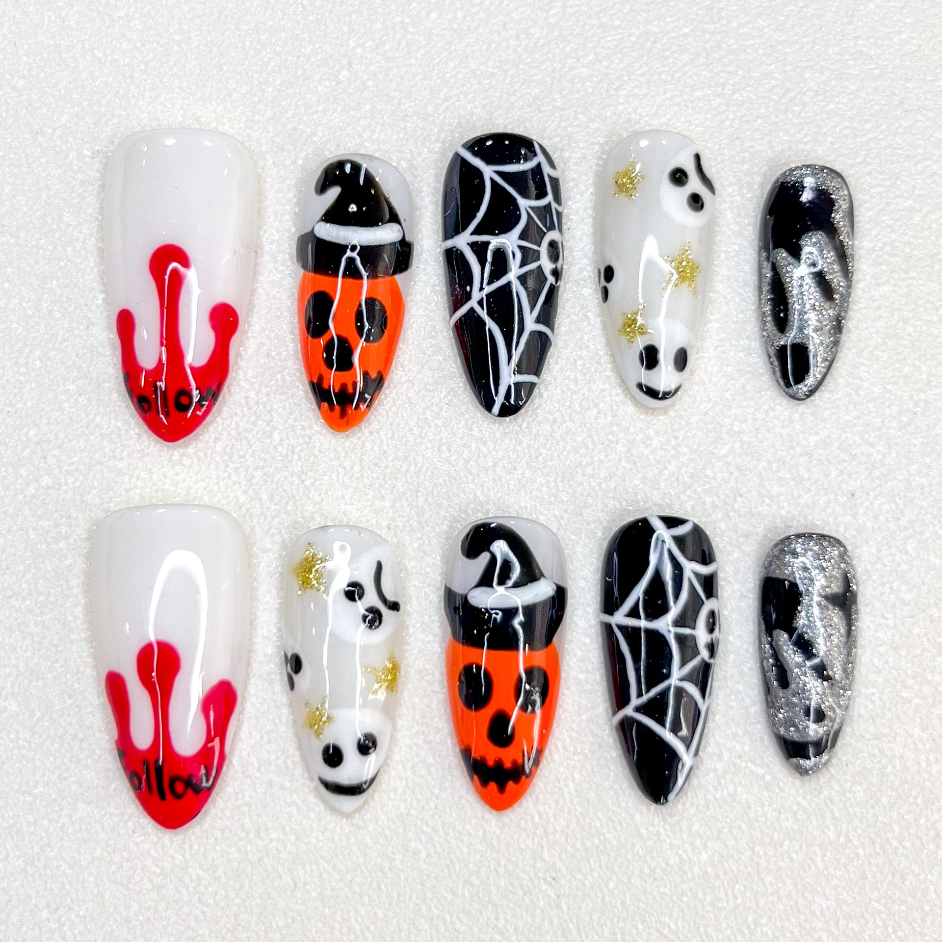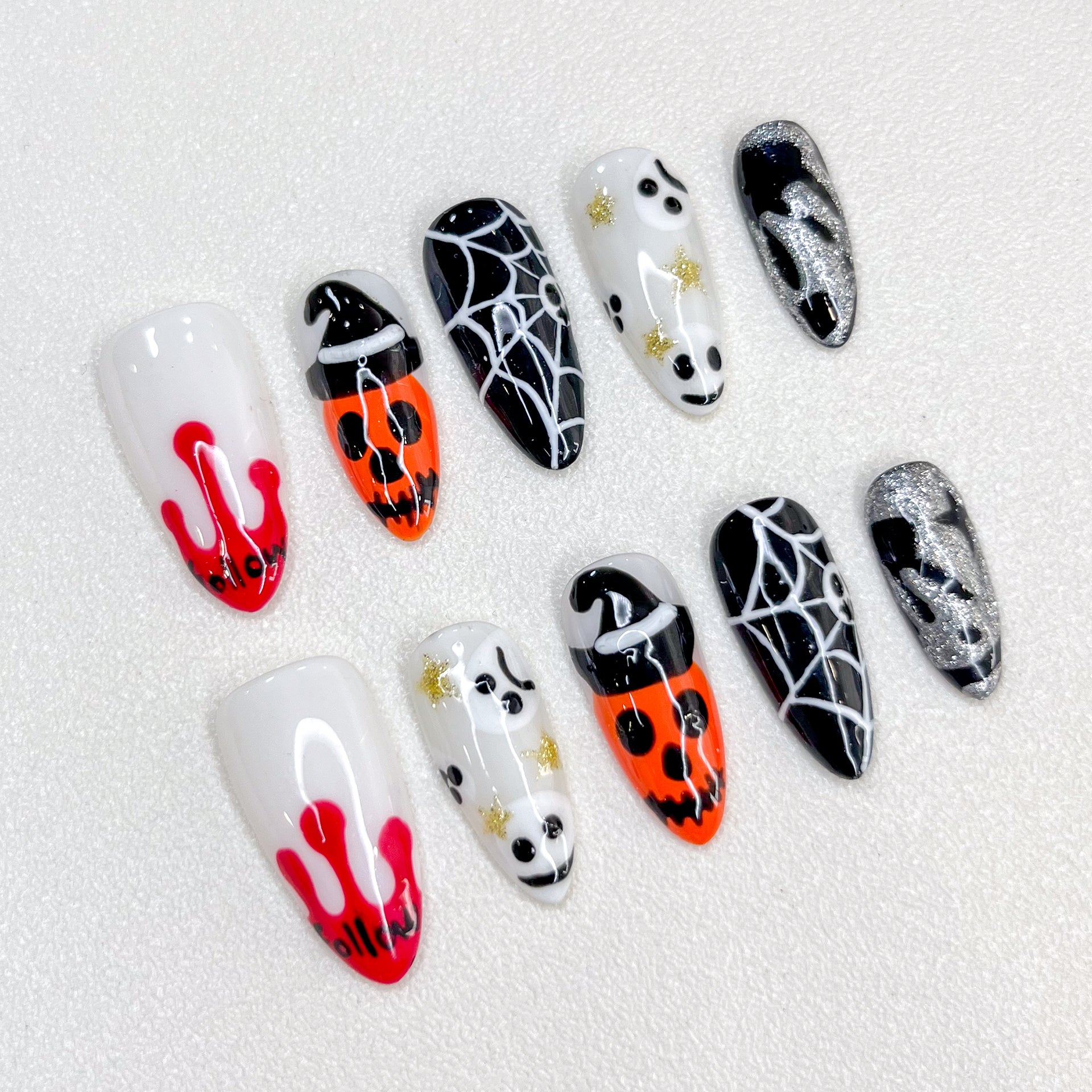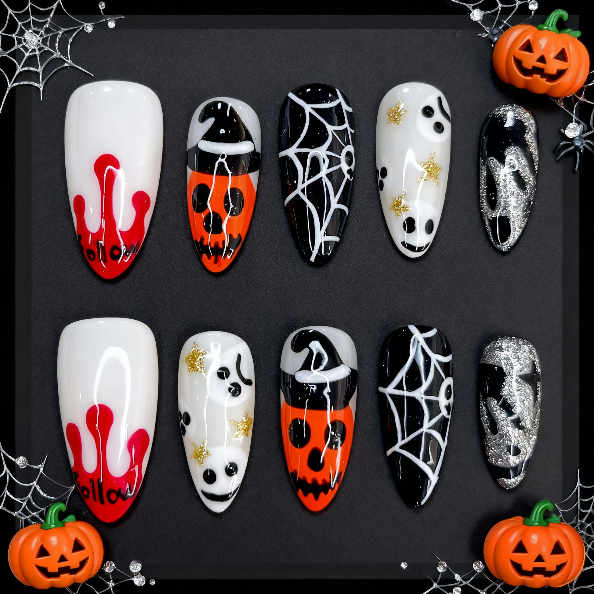 Pumpkin Whisper is a charming 2025 Halloween press-on nail set that blends spooky fun with playful artistry. Featuring hand-painted white ghosts, jack-o’-lantern pumpkins with witch hats, doodle-style spider webs, and bold red blood-drip tips, this set captures the festive spirit of Halloween in a unique and stylish way.