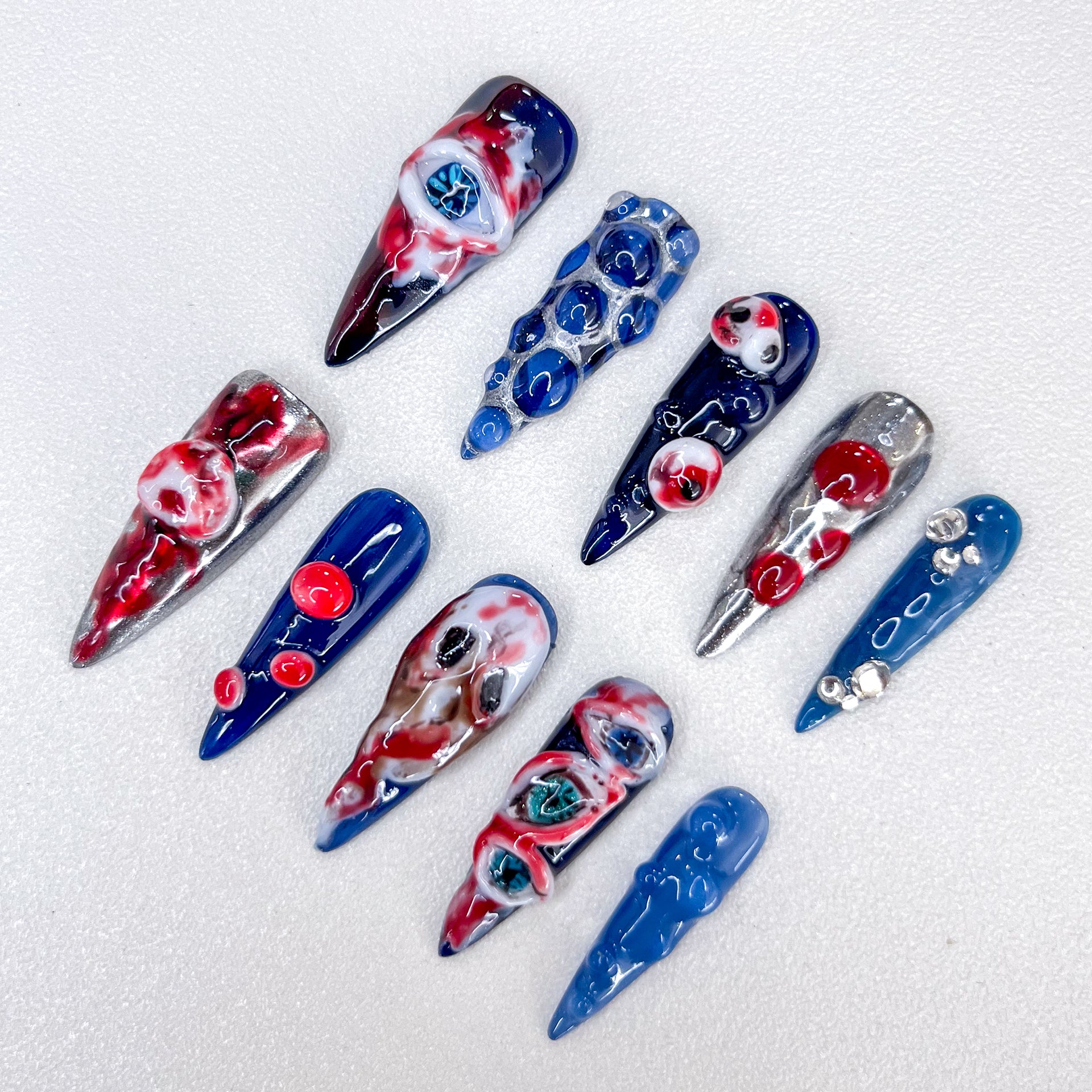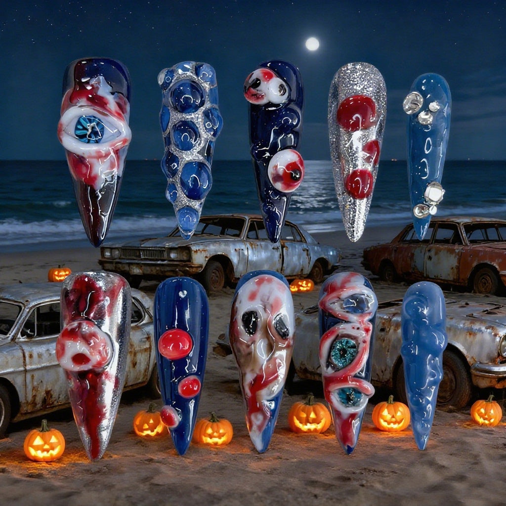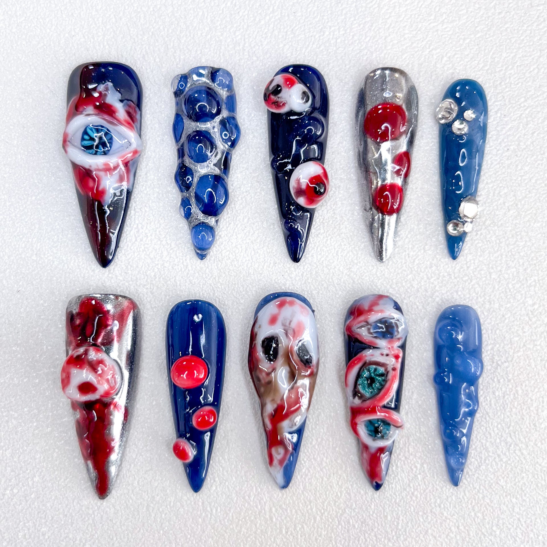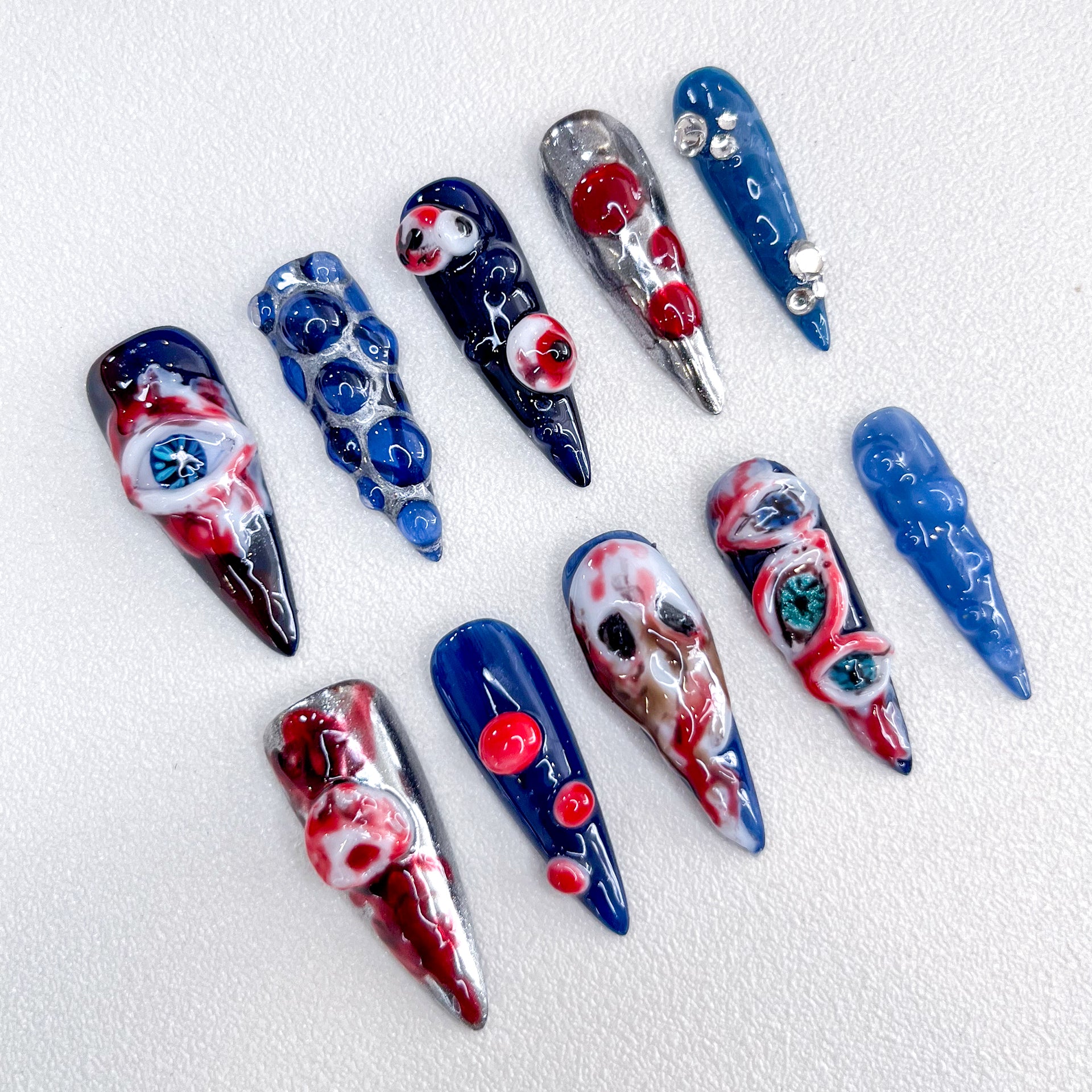 Each nail is meticulously handcrafted with realistic 3D details, blending grotesque beauty with artistic creativity. while the unique horror-inspired designs never go out of style.